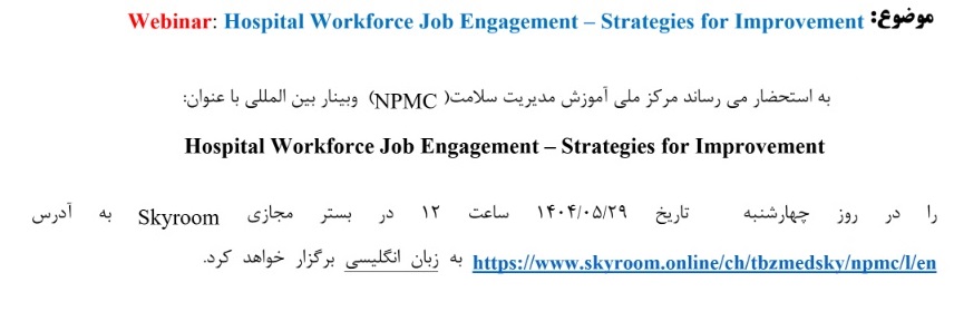 وبینار آموزشی بین المللی Hospital Workforce Job Engagement – Strategies for Improvement ۲۹ مرداد ۱۴۰۴ | ۱۰:۰۱ کد : ۵۳۹۲۵ اطلاعیه ارسال به دیگران نام شما ایمیل شما ایمیل دریافتکننده ارسال انصراف تعداد بازدید:۱۵۶۰ وبینار آموزشی بین المللی Hospital Workforce Job Engagement – Strategies for Improvement