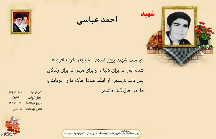 فرازی از وصیت نامه شهدا ۱۳ دی ۱۴۰۴ | ۱۰:۰۱ کد : ۵۷۴۶۹ اطلاعیه ارسال به دیگران نام شما ایمیل شما ایمیل دریافتکننده ارسال انصراف تعداد بازدید:۳۱۹ فرازی از وصیت نامه شهدا فرازی از وصیت نامه شهید بزرگوار احمد عباسی :