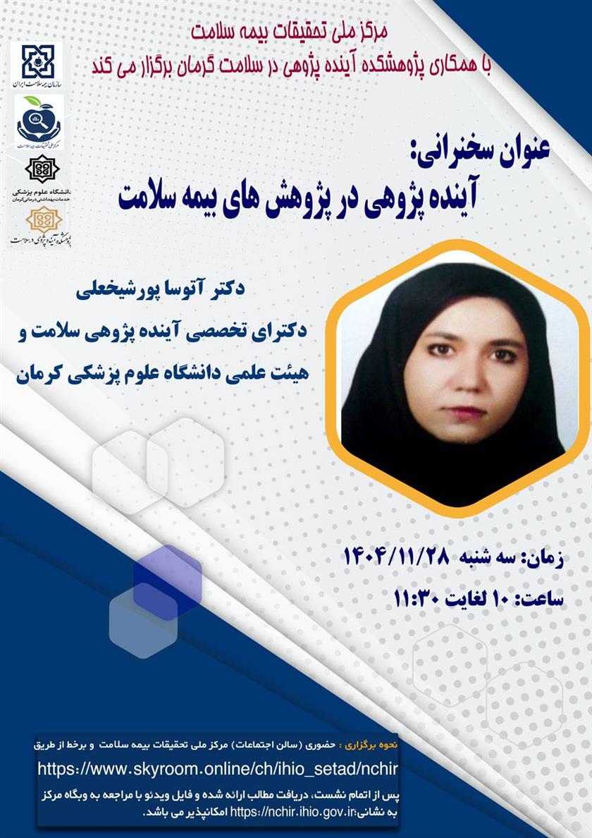 نشست علمی - تخصصی آینده پژوهی در پژوهش های بیمه سلامت ۲۶ بهمن ۱۴۰۴ | ۱۲:۱۹ کد : ۵۸۰۱۲ اطلاعیه ارسال به دیگران نام شما ایمیل شما ایمیل دریافتکننده ارسال انصراف تعداد بازدید:۲۵۶ نشست علمی - تخصصی آینده پژوهی در پژوهش های بیمه سلامت